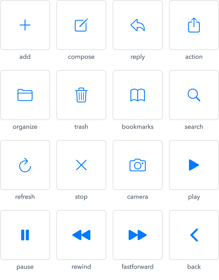 There are also 16 bespoke icons that correspond to the default button icons used in iOS. These are shown below.