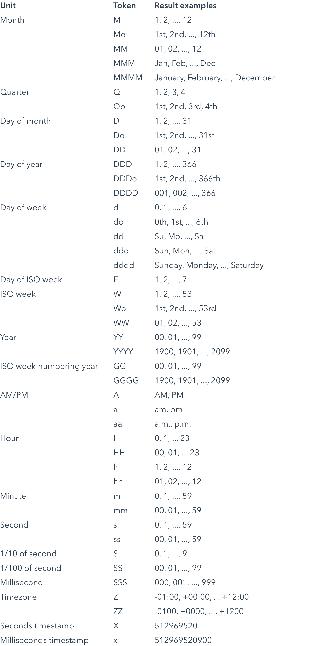 The pattern string may contain any of the tokens shown below. Each matching token in the pattern is replaced with the corresponding date component value.