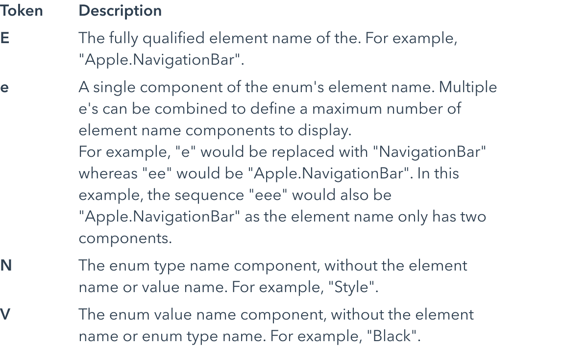 The pattern string may contain the following tokens. The descriptions below use the Apple.NavigationBar.Style.Black enum value as an example.
