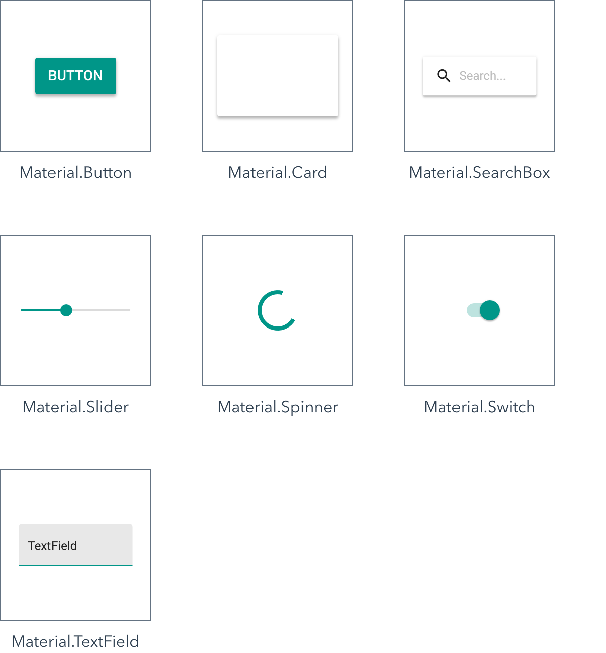The Material namespace contains Material Design controls and effects.