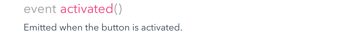 A simple example is the Material.Button.activated() event, the documentation for which is shown below.
