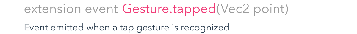 Rectangle { on Gesture.tapped(point) { System.log("Rectangle tapped at", point) } }