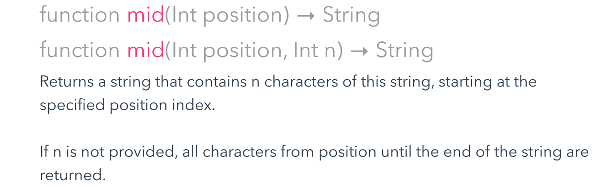 For example, the String.mid() method has two overloads, the documentation for which is shown below.