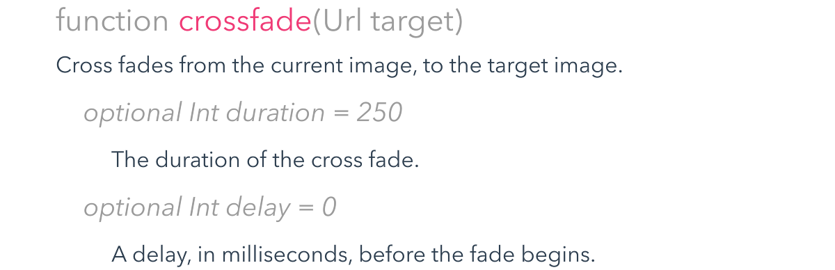 image.crossfade("paris.jpg") image.crossfade("paris.jpg", duration: 500) image.crossfade("paris.jpg", delay: 100, duration: 500)